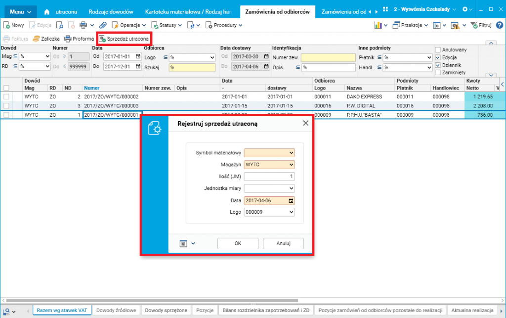 1. W edycji zamówienia od odbiorcy oraz w rejestrze zamówień od odbiorców również dodano procedurę „Rejestruj sprzedaż utraconą”.