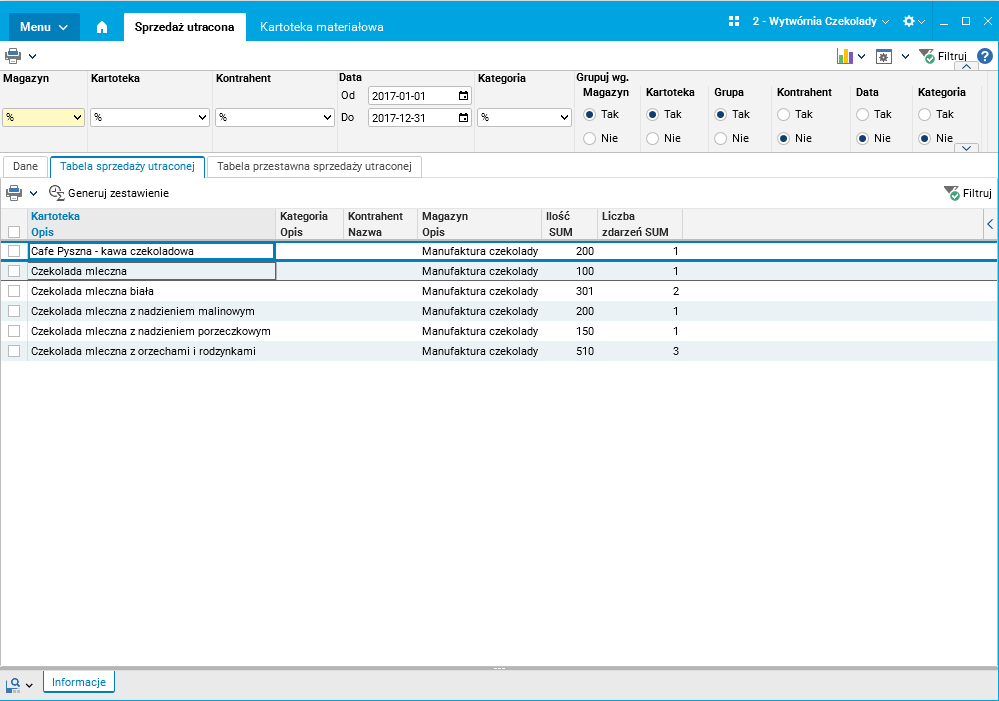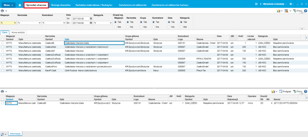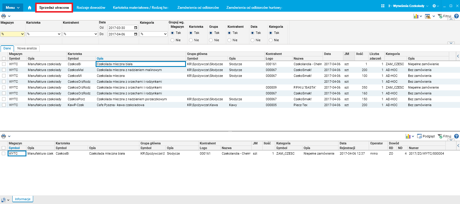 W celu ułatwienia przeprowadzenia analizy sprzedaży utraconej utworzony został słownik Sprzedaż utracona, w którym prezentowane są zagregowane informacje na temat zarejestrowanej sprzedaży utraconej (w zadanym okresie, dla zadanych indeksów materiałowych, oraz wg. grup materiałowych). Dla każdego indeksu/grupy materiałowej prezentowana jest informacja na temat liczby zarejestrowanych zdarzeń oraz ich ilości. W słowniku szczegółowym prezentowane są informacje na temat dokładnych dat i ilości zarejestrowanej sprzedaży utraconej dla każdego indeksu/grupy, jak również informacje na temat kontrahenta, którego sprzedaż dotyczyła, a także operatora, który sprzedaż zarejestrował i kategorii do jakiej dana sprzedaż należy (brak zamówienia, niepełne zamówienie, niepełna realizacja).
