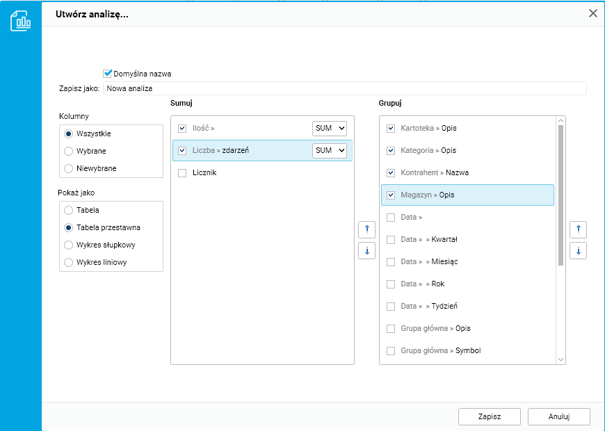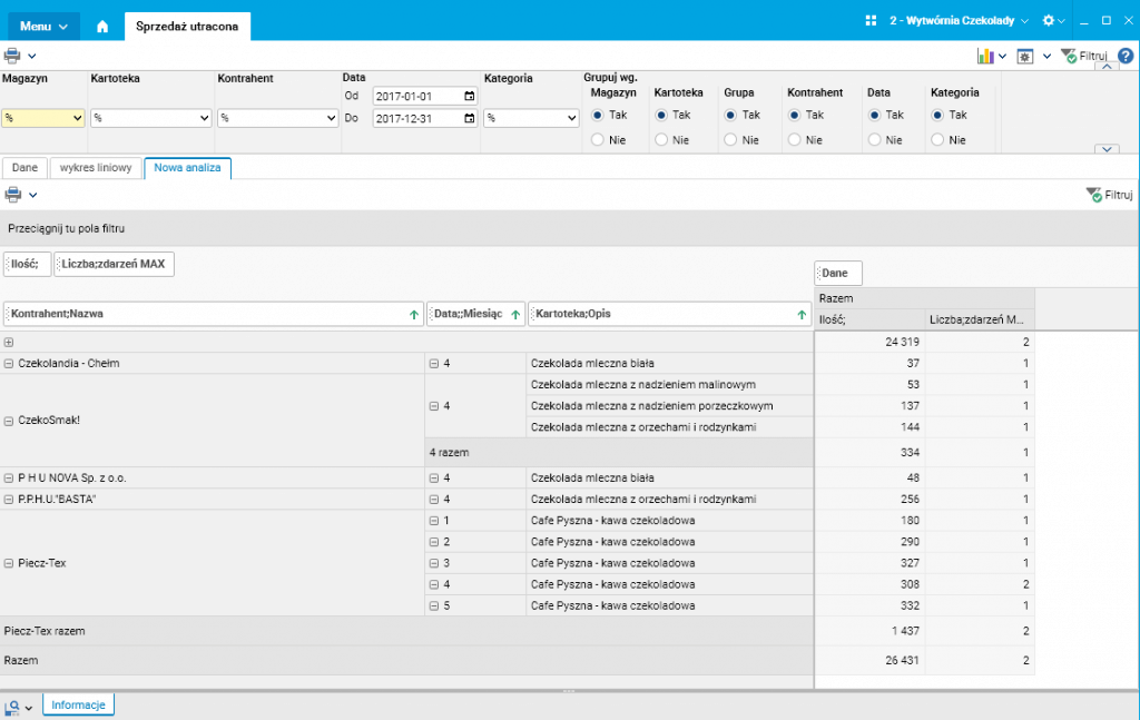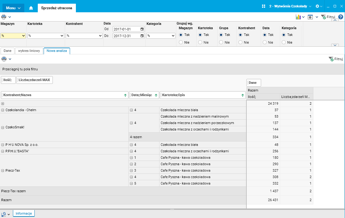 Na podstawie danych zgromadzonych w słowniku „Sprzedaż utracona” klient może tworzyć własne zestawienia korzystając z funkcjonalności „Analizy” (funkcjonalność jest dostępna z poziomu każdego słownika) i agregując dane w postaci: