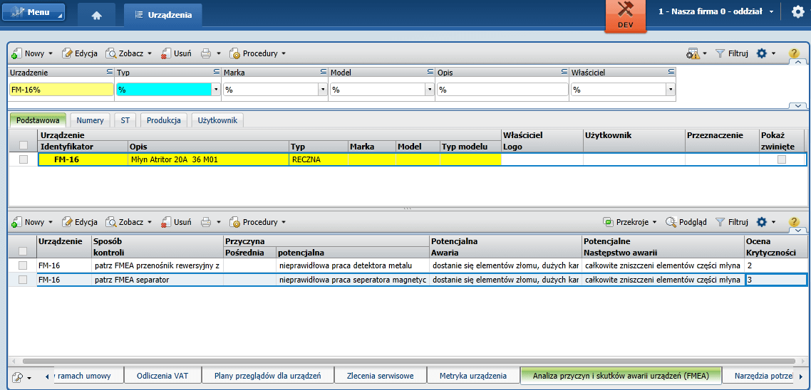 W systemie Asseco Softlab ERP (w module Urządzenia) przygotowana została funkcjonalność „Analiza przyczyn i skutków awarii urządzeń (FMEA)”, która jest wykorzystywana do rejestrowania informacji dotyczących genezy i następstw awarii każdego urządzenia, a także sposobów kontroli, które pozwolą uniknąć ich powstawania. Zarejestrowane informacje są odpowiednio skategoryzowane i łatwo dostępne dla pracowników utrzymania ruchu.