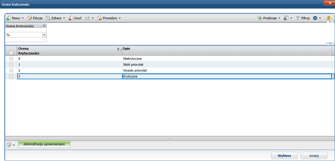 W celu odpowiedniego priorytetyzowania podejmowanych działań istnieje możliwość przypisania do każdego zdarzenia oceny jego krytyczności.
