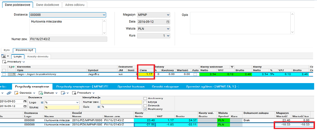 Podczas rejestracji dokumentu zakupowego na dwie sztuki towaru, pracownik działu zakupów błędnie wprowadził cenę towaru. W miejsce prawidłowej ceny 1.17 zł została wprowadzona cena 11.70 zł (różnica to 10.53 zł).  Do momentu zidentyfikowana pomyłki, z dwóch sztuk zakupionego towaru jedna została już sprzedana.