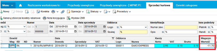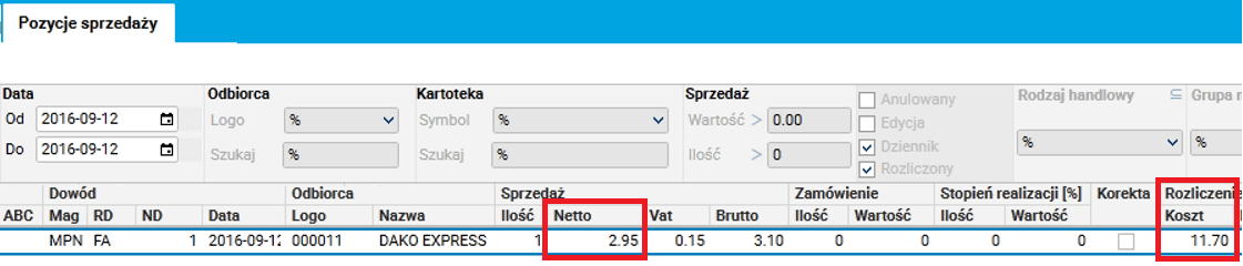 Pozycje sprzedaży pokazują, że towar sprzedany za 2.95 ma wartość KWS 11.70