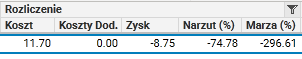 Analiza pokazuje stratę w kwocie -8.75 i odpowiednio ujemny narzut oraz ujemną marżę.