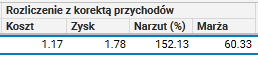 Koszt jest tu prawidłowy i wynosi 1.17 zł. Podobnie uzyskana marża, jak i narzut.