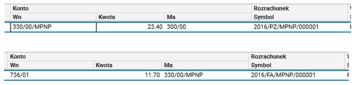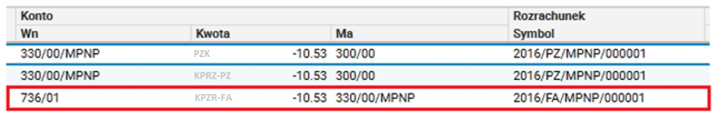 W przypadku opisanego w pierwszym przykładzie błędu, księgowanie PZ oraz KWS wygląda następująco: