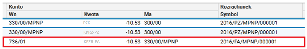 Trzecie księgowanie wynika z korekty technicznej drugiego obrotu jakim jest FA  (Wn 736 | Ma 330).