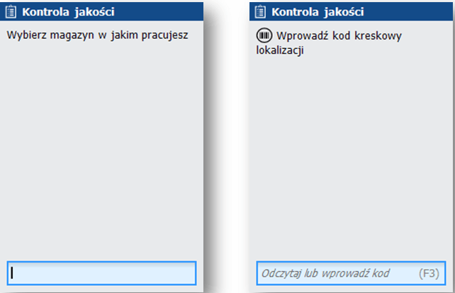 Osoba wykonująca kontrolę wybiera z menu aplikacji na terminalu radiowym proces kontroli jakości, magazyn, a następnie lokalizację, w której będzie realizowała kontrolę.