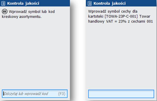 Rys. 2. Kontrola jakości – wybór towaru do kontroli oraz wprowadzanie symbolu cechy