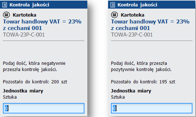 Rys. 3. Kontrola jakości – wprowadzenie ilości, która nie przeszła i przeszła weryfikację kontroli jakości