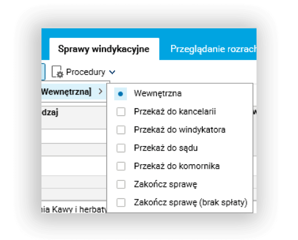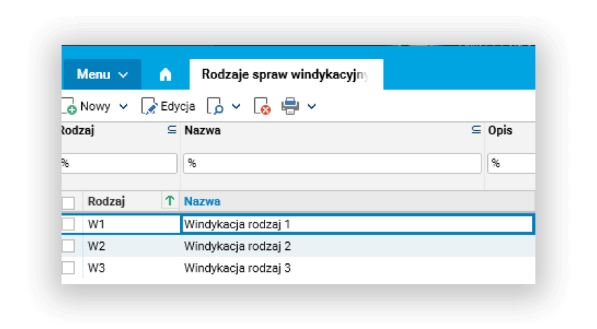 - rodzaje spraw windykacyjnych – umożliwiają podział spraw windykacyjnych wg rodzaju