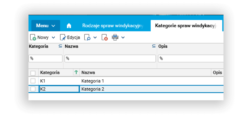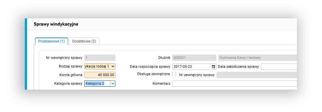 - kategorie spraw windykacyjnych – umożliwiają nadanie odpowiedniej kategorii konkretnej sprawie windykacyjnej