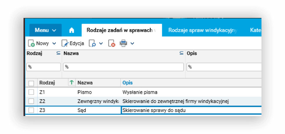 - rodzaje zadań – umożliwiają zdefiniowanie wszystkich rodzajów działań, które są podejmowane w konkretnej sprawie windykacyjnej