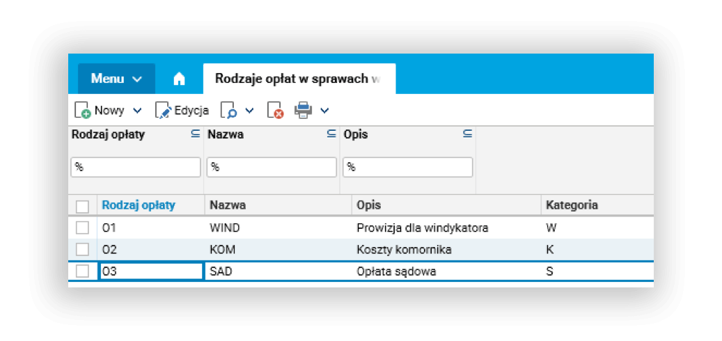 - rodzaje opłat – umożliwiają zdefiniowanie wszystkich rodzajów opłat, które są ponoszone w procesie windykacji