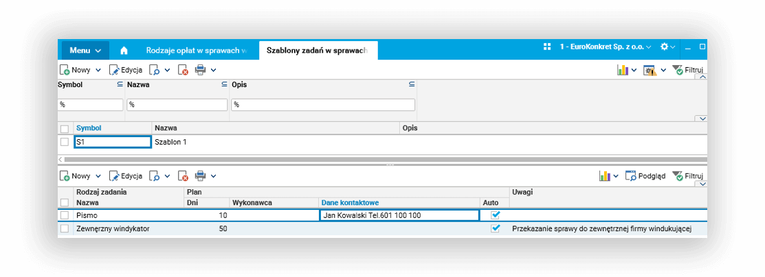 - szablony zadań – umożliwiają stworzenie wielu szablonów (schematów postępowania), dla których podłączone zostają zdefiniowane wcześniej działania
