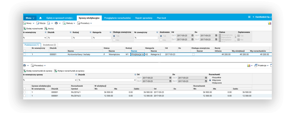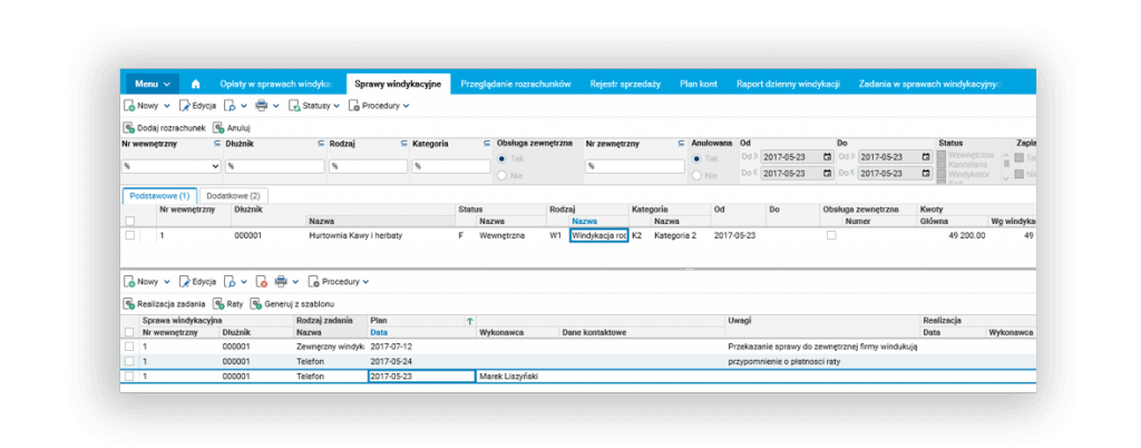 - zdefiniowanie ról dla kontrahentów potrzebnych do prowadzenia sprawy windykacyjnej – SĄD, KOMORNIK, KANCELARIA, WINDYKATOR.