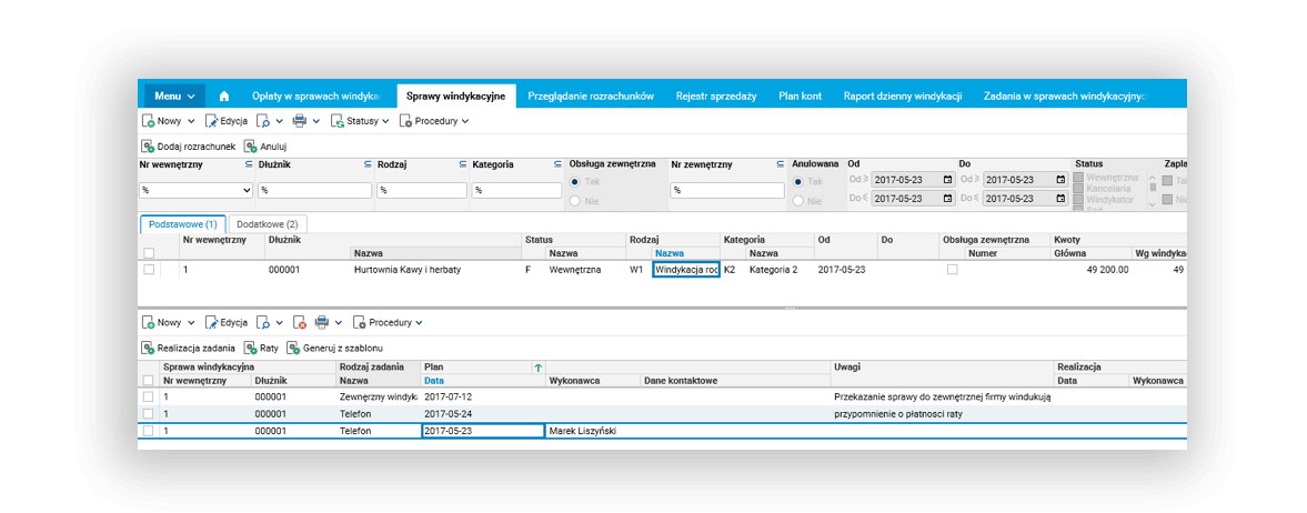 Dodatkowo, zdefiniowany został oddzielny słownik zawierający wszystkie zadania z różnych spraw windykacyjnych, który może być pomocny przy planowaniu pracy pracownika prowadzącego windykacje. Słownik ten umożliwia określenie statusu danego zadania (np. jako wykonane) oraz dopisanie notatek (np. z przeprowadzonej rozmowy telefonicznej).