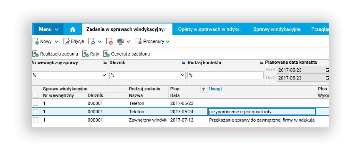 - Usprawnienie kontroli i harmonogramu realizacji działań windykacyjnych.