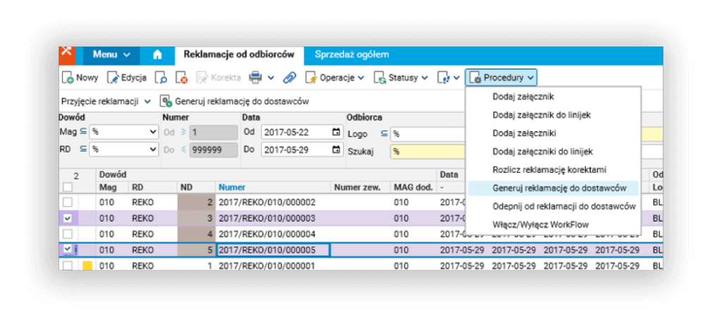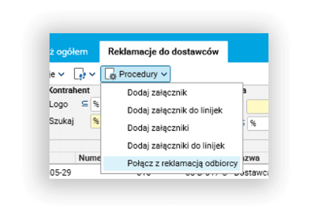 Usprawniono również proces tworzenia reklamacji zbiorczej do dostawcy, na podstawie wielu reklamacji odbiorców lub wewnętrznych, dostępnych w dedykowanym przekroju „Dowody bez reklamacji do dostawców”. Aby ułatwić zarządzanie reklamacjami składowymi (powiązanymi z reklamacją zbiorczą) dodano w rejestrze „Reklamacje do dostawców” nowy szczegół: „Reklamacje od odbiorców“, który umożliwia operowanie wszystkimi reklamacjami od odbiorców i wewnętrznymi podpiętymi pod reklamację zbiorczą do dostawcy. Dodatkowo, praca z reklamacjami odbiorców lub wewnętrznymi wysłanymi do dostawcy może odbywać się z poziomu nowego, dedykowanego przekroju „Dowody z reklamacjami do dostawców“ pokazującego jedynie takie reklamacje.