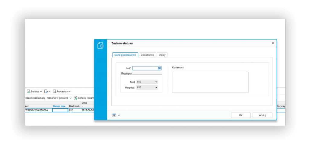 Nową opcją jest także możliwość definiowania ‘Dzielenia reklamacji’. Funkcjonalność ta polega na tym, że w przypadku podania ilości mniejszej niż reklamowana, reklamacja dzielona jest (podczas zmiany statusu) na dwie. Dzięki temu możliwe jest obsłużenie sytuacji, gdy uznajemy reklamację tylko na część z reklamowanej ilości.