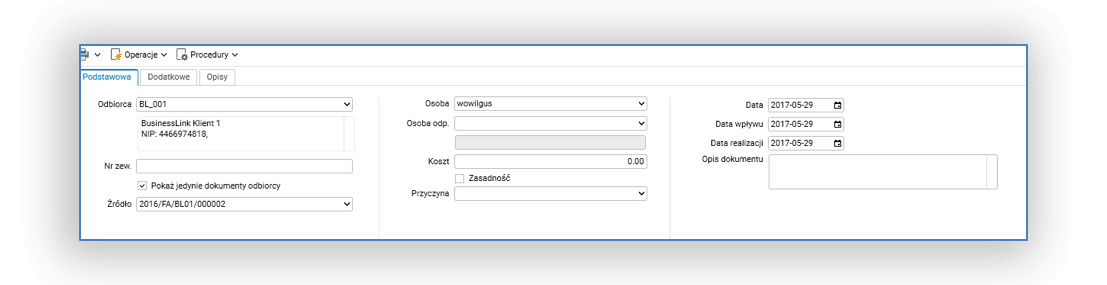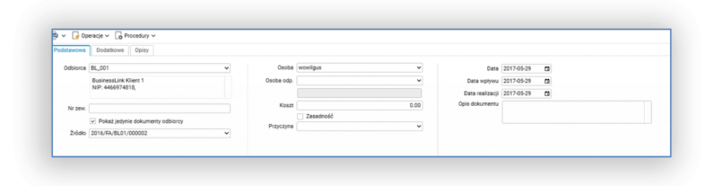 Rys 1. Edycja nagłówka reklamacji – zakładka Podstawowa