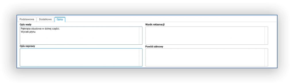 Rys 3. Edycja nagłówka reklamacji – zakładka opisy