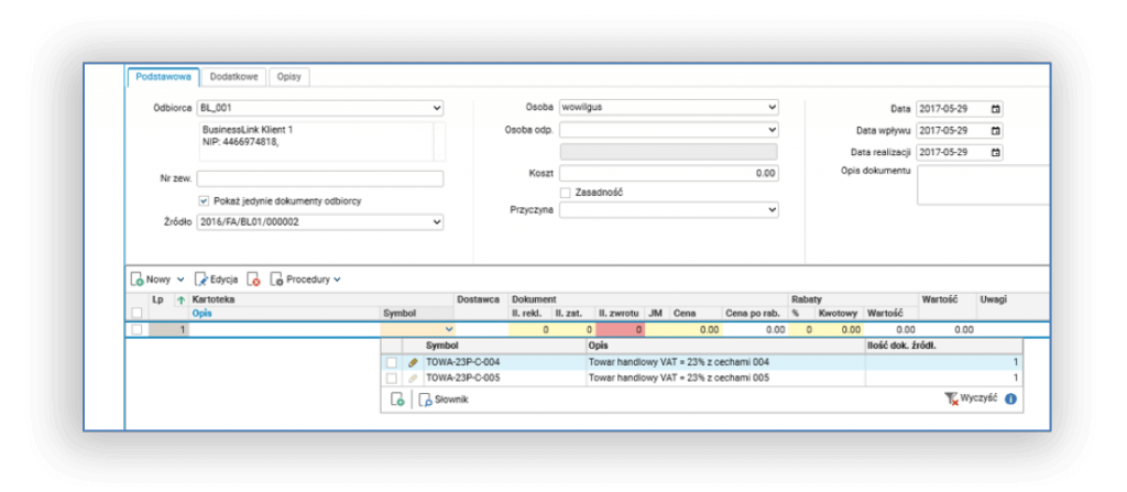 Dokument reklamacji od odbiorcy można wystawić zawsze dla jednej pozycji materiałowej. Proces ten usprawniono w taki sposób, że po wybraniu w nagłówka reklamacji dokumentu źródłowego dla reklamacji odbiorcy (np. faktury zakupu), w linijce są dostępne do wyboru jedynie towary z tego dokumentu: