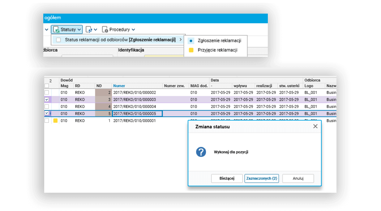 Pracownik biura obsługi klientów zarejestrował w systemie Asseco Softlab ERP kilka reklamacji od klientów. Uzupełnił dane dotyczące dokumentu sprzedaży (z którym łączy się ta reklamacja) dzięki czemu skorzystał z podpowiedzi towaru z listy pozycji możliwych do zareklamowania (czyli obecnych na odpowiednim dokumencie sprzedaży). W kolejnym kroku chciał przyjąć te reklamacje do realizacji oraz wysłać je do dostawcy jako jedną reklamację zbiorczą. W tym celu pracownik potwierdził przyjęcie reklamacji korzystając z możliwości grupowej zmiany statusu: