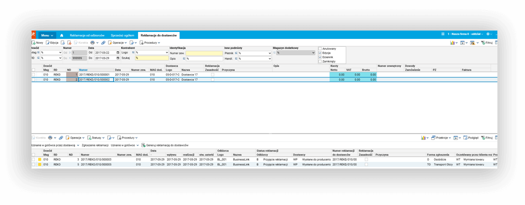 Dodatkowo (w zależności od konfiguracji), utworzone zostały odpowiednie dokumenty magazynowe przyjmujące reklamowany towar na magazyn reklamacyjny i wydające go do dostawcy. Od tego momentu uprawnione osoby mają możliwość łatwego podglądu i dalszej obsługi (poprzez zmianę statusów) zarówno reklamacji składowych odbiorcy, jak też poszczególnych towarów u dostawcy.