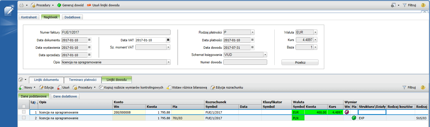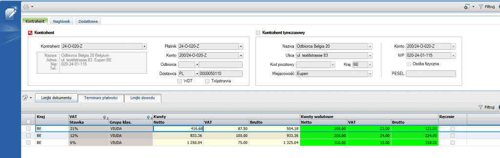 Rysunek 2. Nagłówek i linijki dokumentu VIUD – zakładka kontrahent