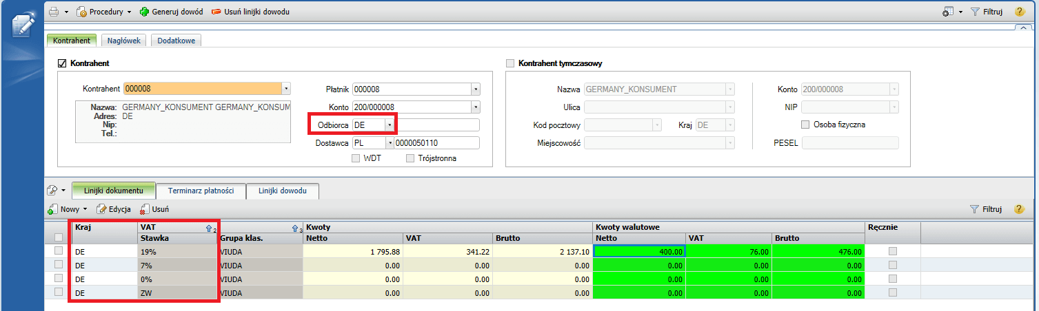 Sprzedaż oprogramowania dla osoby prywatnej z Niemiec należy zarejestrować w rejestrze WDT i wydzielonym rodzaju dowodu np. VIU-D.  W nagłówku dowodu na zakładce Kontrahent należy wpisać kraj DE w polu Odbiorca oraz odznaczyć pole WDT. Po przejściu do linijek dokumentu w kolumnie Kraj zainicjuje się kraj z nagłówka – pole to oznacza kraj, w którym powinien być rozliczony podatek VAT dla tej operacji. W kolumnie Stawka VAT będą dostępne stawki obowiązujące w Niemczech. Należy wybrać odpowiednią i uzupełnić kwoty w walucie oraz w złotych. Jako kurs waluty należy wpisać kurs EUR z dnia poprzedzającego sprzedaż.
