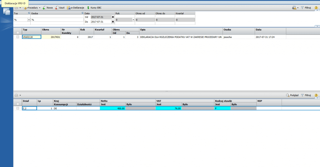 Wprowadzono nowy słownik przechowujący dane wykazywane w deklaracjach VIU-D (dane sumaryczne oraz szczegółowe dokumenty). W słowniku dostępne są procedury do generowania nowych deklaracji oraz ich elektronicznej wysyłki. Ponieważ wartości w deklaracji VIU-D są przeliczane według kursów EBC na dzień sporządzenia deklaracji i wykazywane w walucie EUR, dlatego też na potrzeby tych przeliczeń w słowniku deklaracji VIU-D dodaliśmy procedurę pozwalająca przejść do słownika kursów EBC i uzupełnić odpowiednie kursy lub je zaimportować. Są to kursy poszczególnych walut w stosunku do waluty EUR.