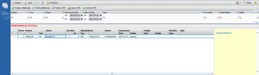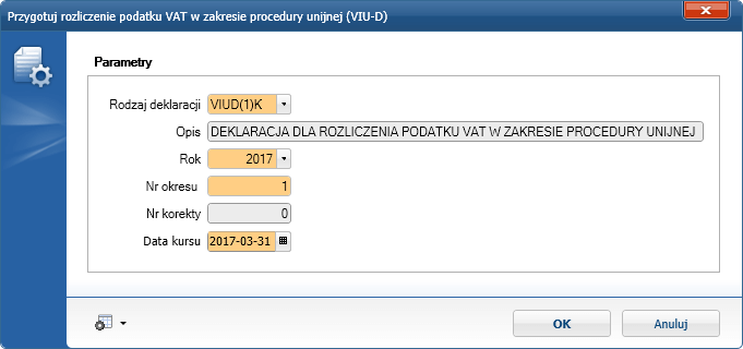Firma ma sporządzić deklarację VIU-D na koniec kwartału. W tym celu należy odszukać odpowiedni słownik przechowujący dane dla deklaracji VIU-D i naliczyć dane za wskazany okres.
