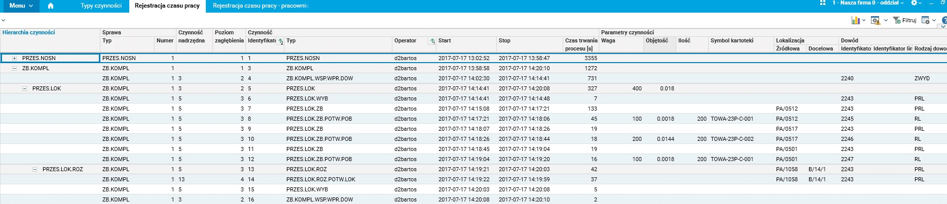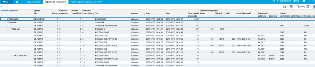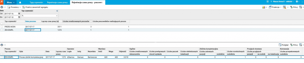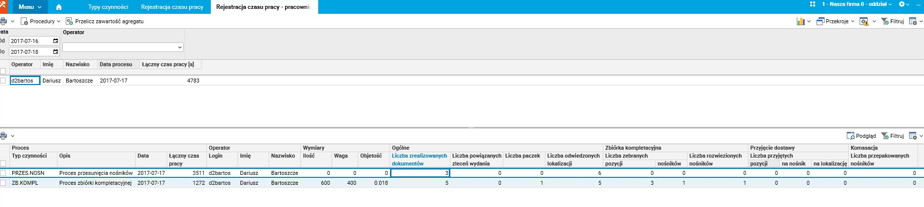 Na raporcie zbiorczym znajduje się lista operatorów wraz z informacją o łącznym czasie pracy. Dla każdego magazyniera dostępna jest również szczegółowa analiza wszystkich procesów, jakie w wybranym dniu realizował, wraz z informacją o czasie poświęconym na konkretny proces, łącznej ilości asortymentu i jego gabarytach oraz ilości dokumentów, pozycji, nośników, lokalizacji w podziale na grupy operacji.