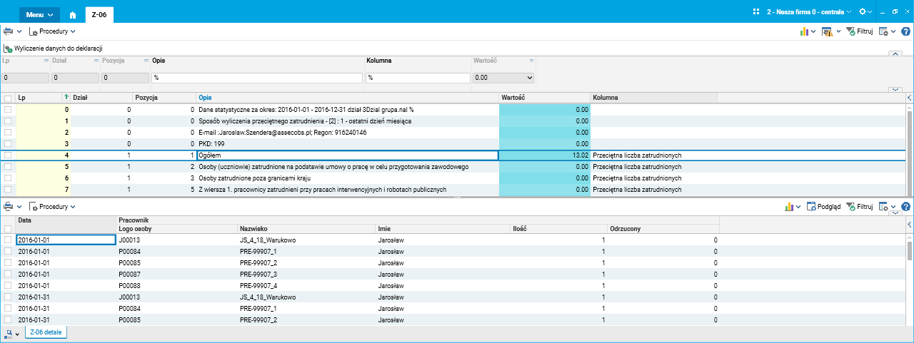 Wprowadzono szczegół Z-06 Detale w zestawieniu GUS Z-06, prezentujący informacje o pracownikach z punktu Lp. 4 Dział 1. Zatrudnienie i wynagrodzenia, pozycja 1. Ogółem. Informacje zawarte w tym szczególe umożliwiają dokładniejszą analizę sprawozdania GUS Z-06. Wyszczególnieni są wszyscy pracownicy uwzględnieni w pozycji Ogółem w zestawieniu, zgodnie z wyjaśnieniami do formularza.