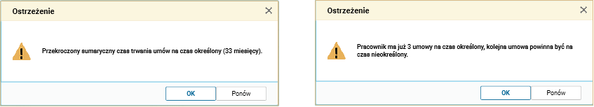 Rys. Przykładowe ostrzeżenia dotyczące ilości oraz długości umów
