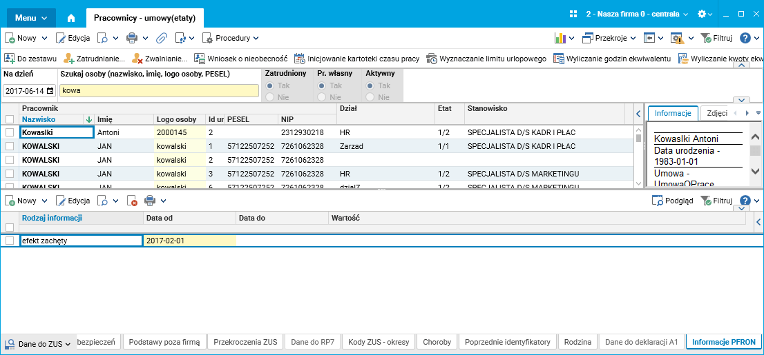 Rys. Słownik Pracownicy – umowy(etaty), szczegół Dane do ZUS/Informacje PFRON, efekt zachęty