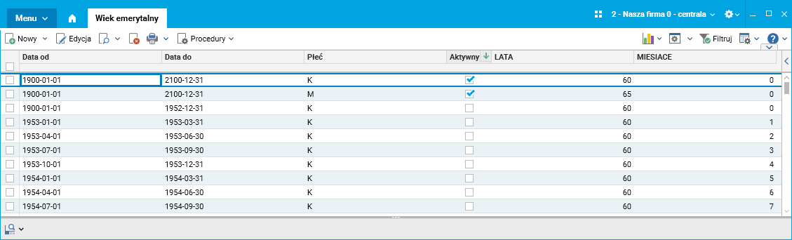 W module Kadry, w menu Konfiguracja dodano słownik konfiguracyjny Wiek emerytalny. Słownik zawiera informacje o latach i miesiącach wymaganych do przejścia na emeryturę dla poszczególnych płci i okresów urodzeń. Słownik pozwala na obsłużenie przypadku naliczania emerytury dla okresów przejściowych.