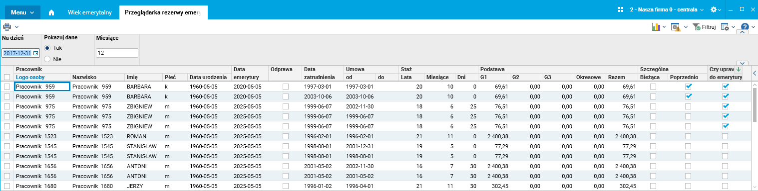 · Czy uprawniony do emerytury – informacja pobierana jest z danych pracownika z pola Ustalone prawo do emer./renty w szczególe Kody ubezpieczeń zgodnie z maską Na dzień.