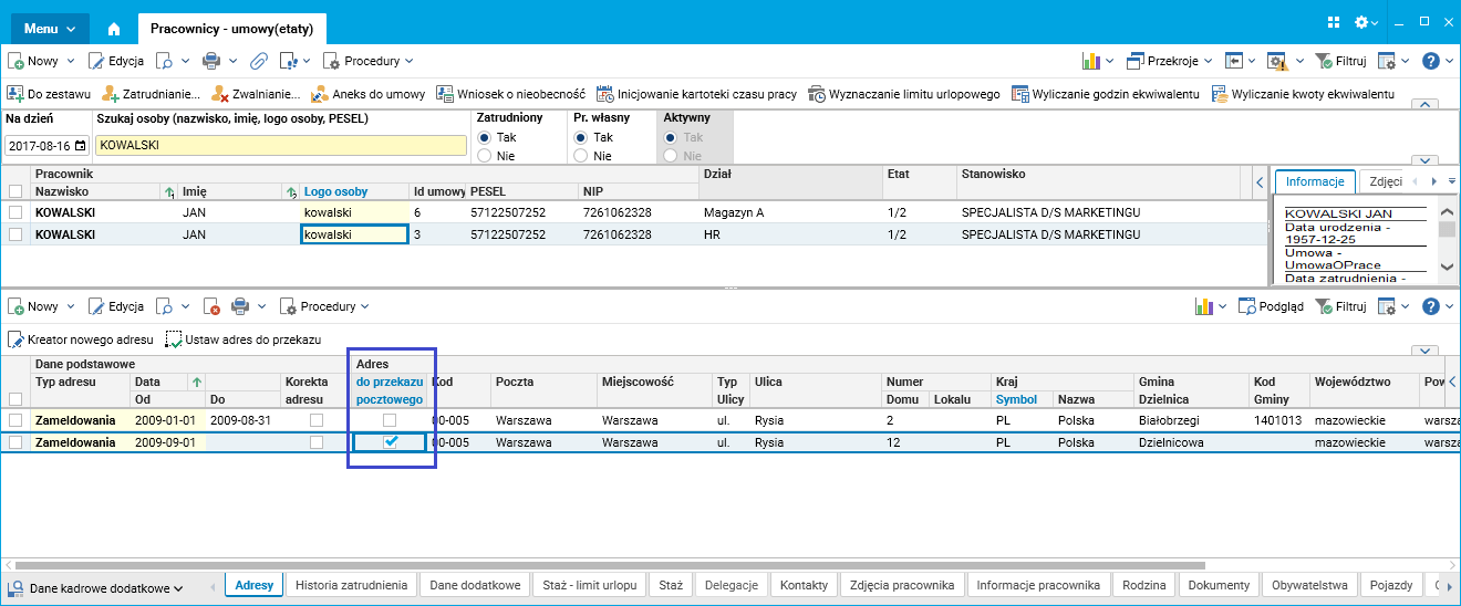 W szczególe Adresy słownika Pracownicy – umowy(etaty) dodano kolumnę Adres do przekazu pocztowego.