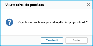 Do zaznaczenia adresu lub do jego zmiany służy procedura Ustaw adres do przekazu dostępna w szczególe Adresy. Można zaznaczyć tylko jeden adres dla pracownika, dlatego zaznaczenie jednego adresu powoduje automatycznie odznaczenie innego, jeśli wcześniej taki był wybrany.