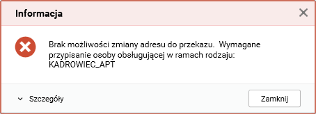 Dla umów bezosobowych zmiana adresu do przekazu pocztowego, czyli możliwość użycia procedury Adres do przekazu pocztowego, uzależniona jest od statusu umowy i rodzaju obsługi przypisanego do operatora. Operator z rolą KONSULTANT może zmienić adres do przekazu, gdy umowa bezosobowa znajduje się w stanie EDYCJA, natomiast operator z rolą KADROWIEC_APT może zmienić adres w umowie o dowolnym statusie. Przykładowy komunikat blokujący zmianę adresu znajduje się poniżej.