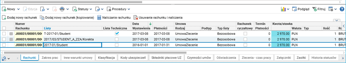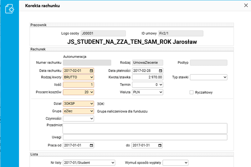 2. Użycie procedury Korekta rachunku dla danego rachunku ze wskazaniem listy płacowej z punktu 1. Procedura Korekta rachunku dostępna jest w słowniku Kartoteka rachunków.
