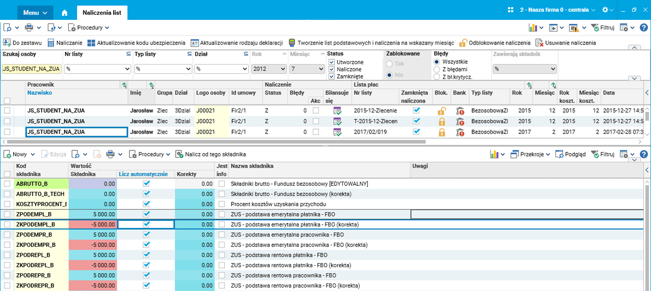 3. Aplikacja tworzy naliczenie rachunku na technicznej liście płac, a różnicę między składnikami korygowanego i technicznego rachunku umieszcza na wskazanej liście płac.
