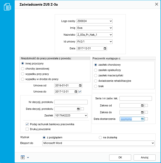 Rys. Parametry wydruku zaświadczenia ZUS Z-3a