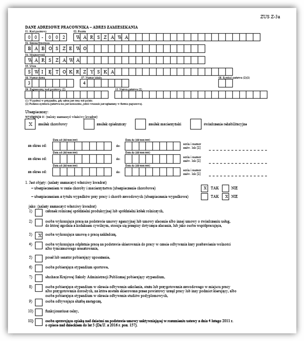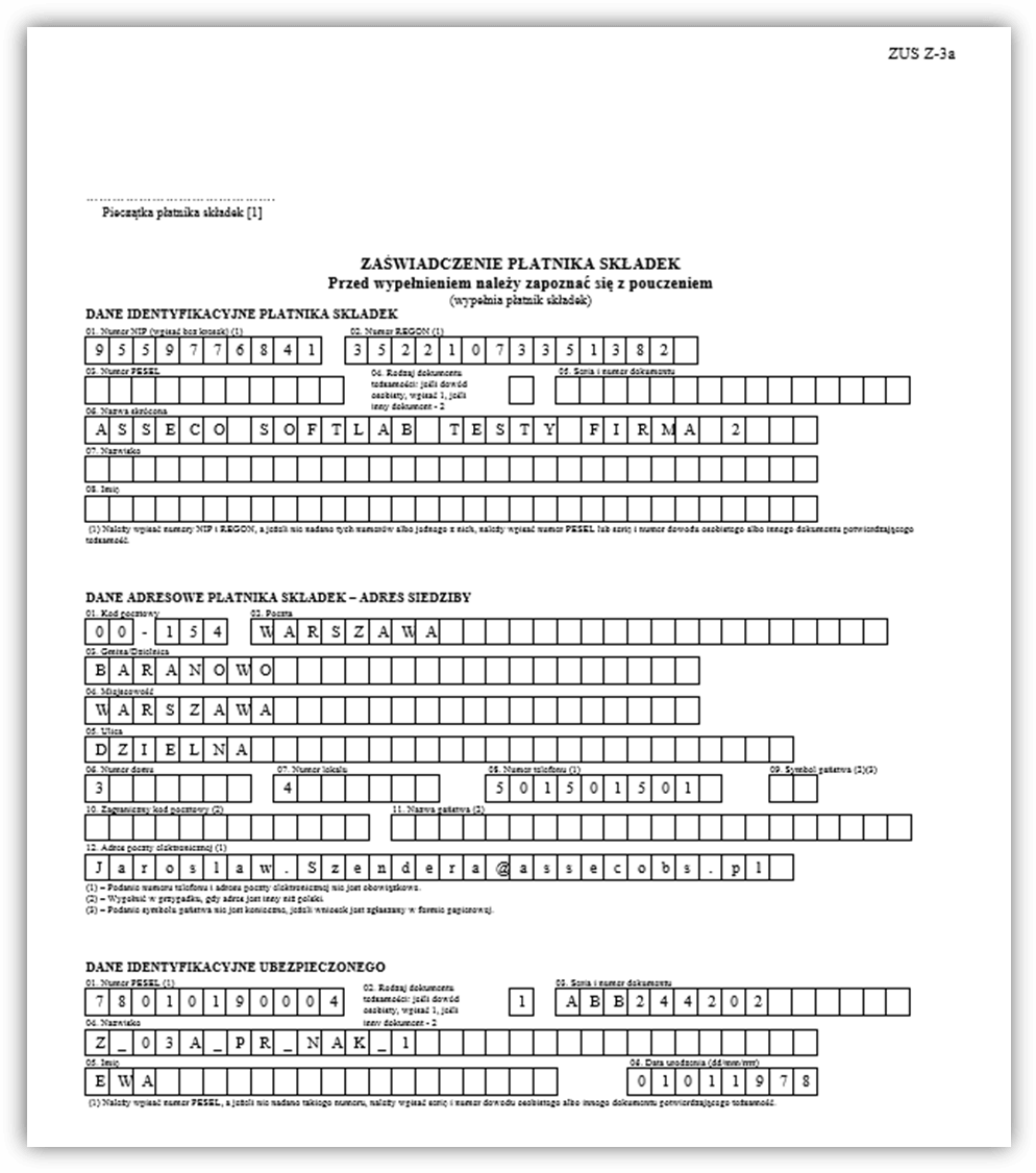 Rys. Przykład zaświadczenia ZUS Z-3a, strona 1