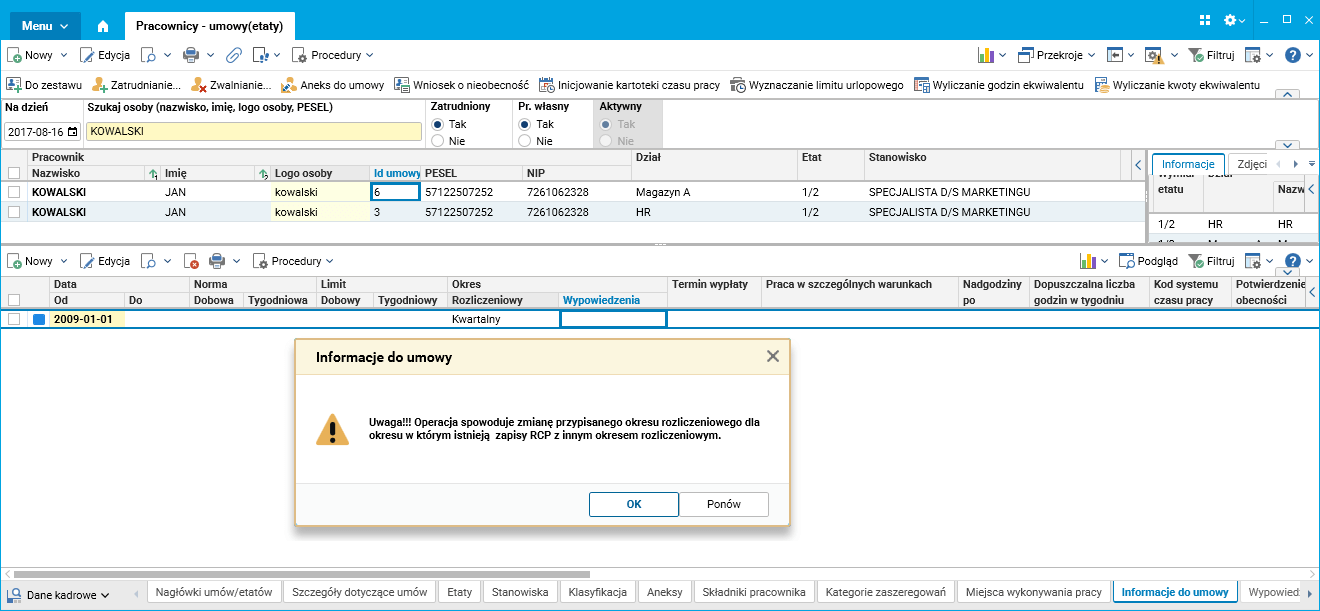 ·         Pracownicy – umowy(etaty), szczegół Informacje do umowy zmiana w polu Okres rozliczeniowy,