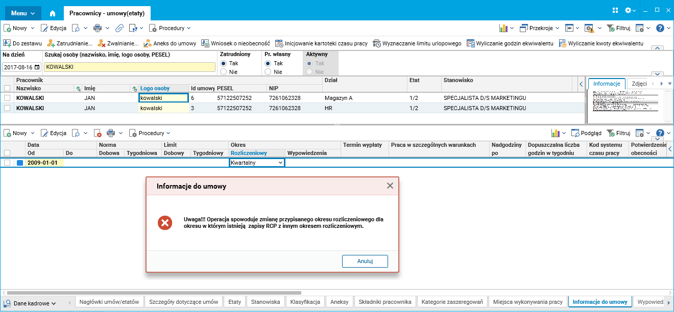 Kontrola możliwości zmiany okresu rozliczeniowego przypisanego do pracownika