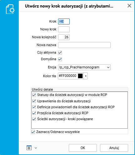 · Czy aktywna, Domyślna, Encja, Kolor tła – wartości tych parametrów są inicjowane jak dla kopiowanego kroku ścieżki, użytkownik może je dowolnie edytować,