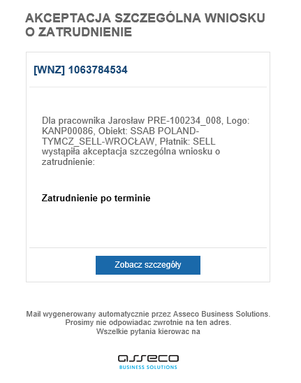 Rys. Przykładowe powiadomienie mailowe o autoryzacji mobilnej dla wniosku o zatrudnienie
